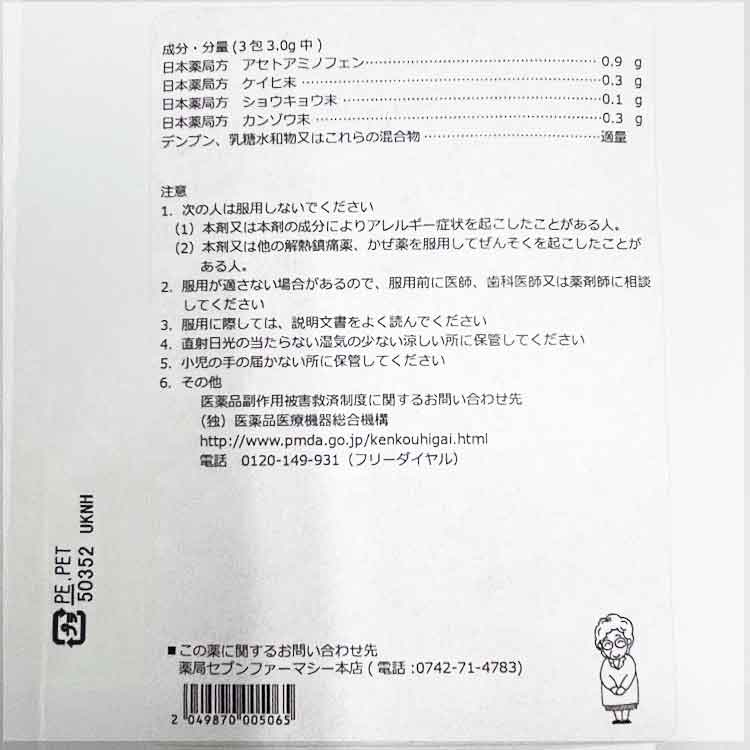 解熱鎮痛剤1号Aは,アセトアミノフェンにケイヒ末等の生薬を配合した内服薬で,頭痛,疼痛等の緩解,悪寒発熱時の解熱に用いられます