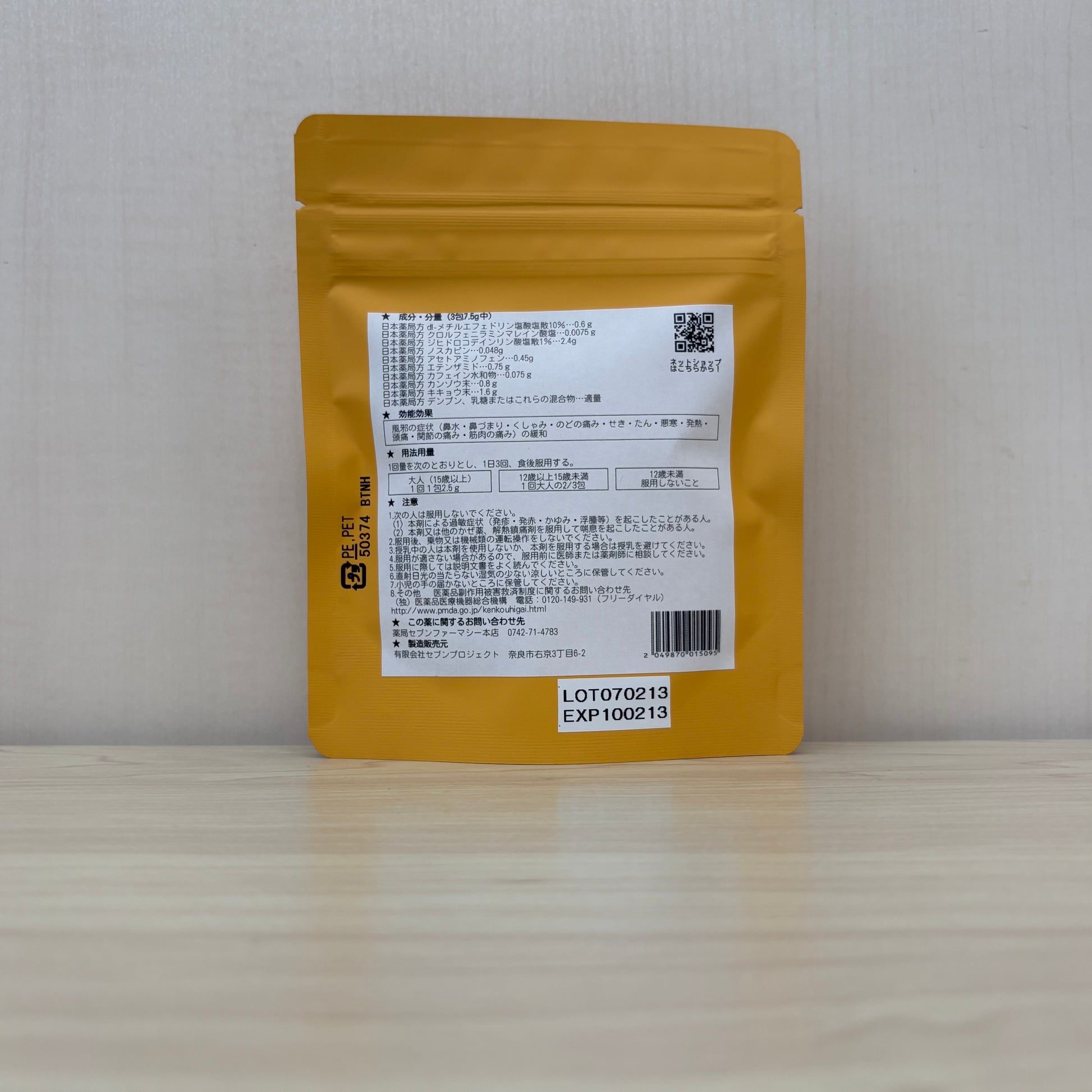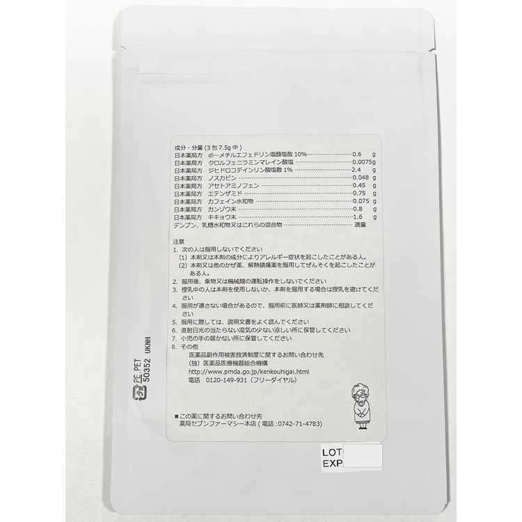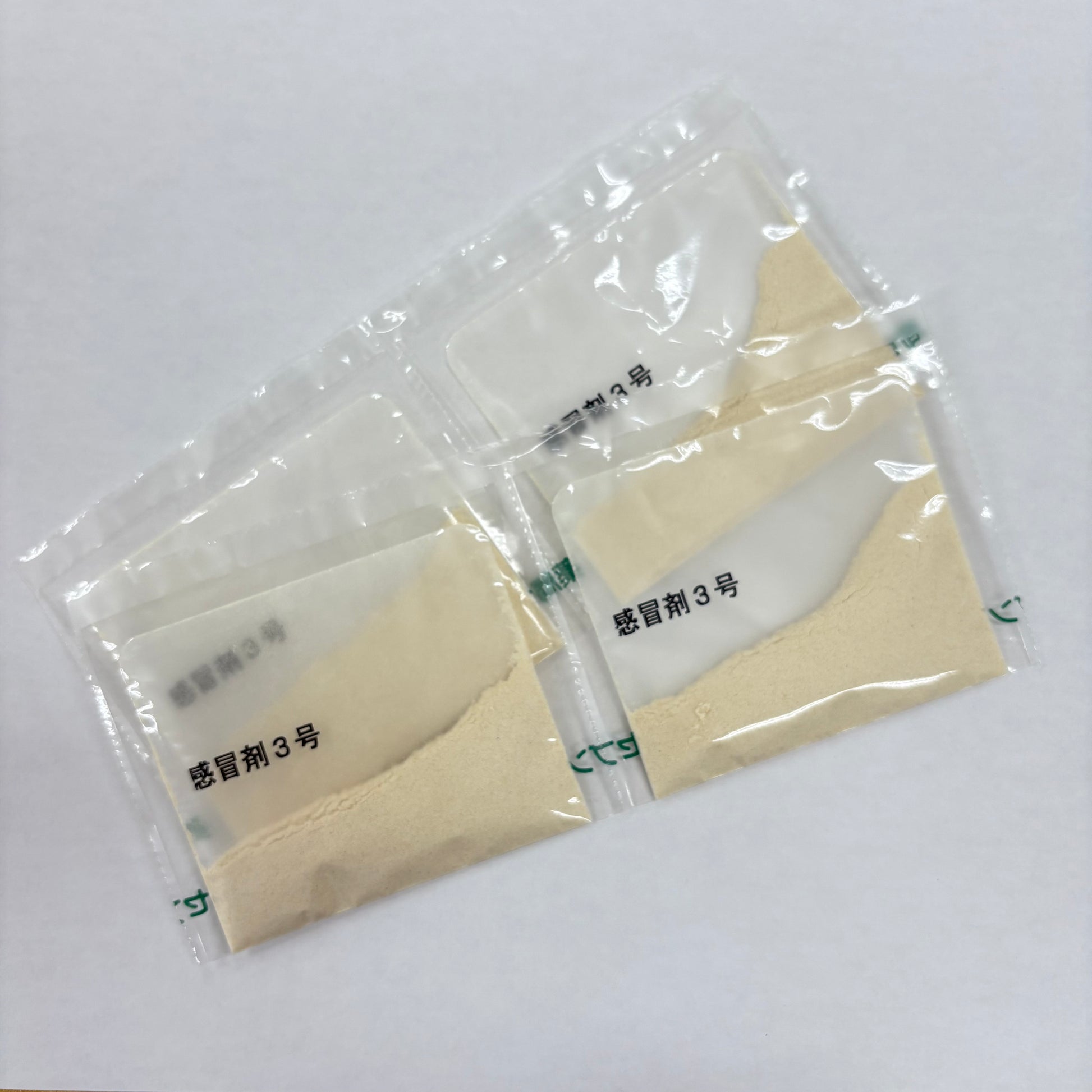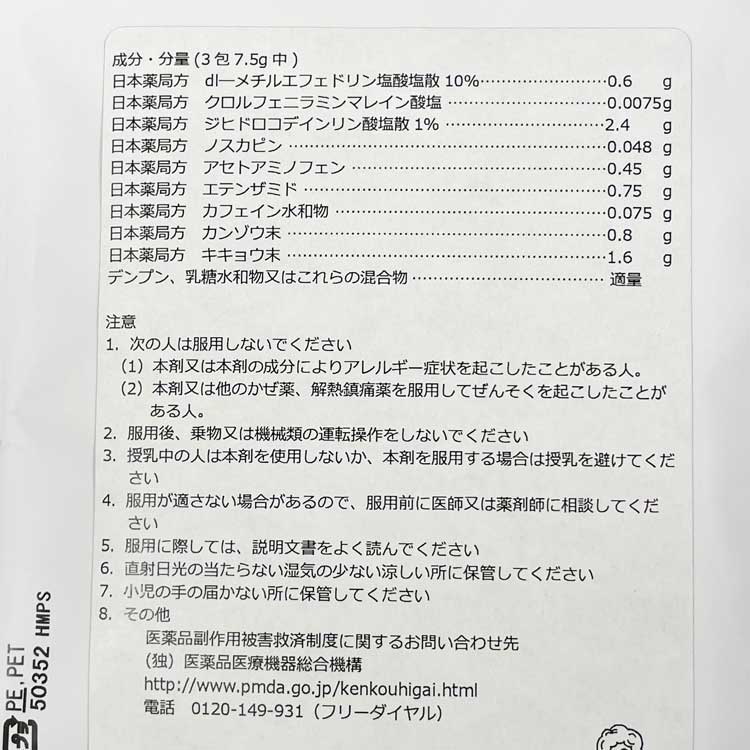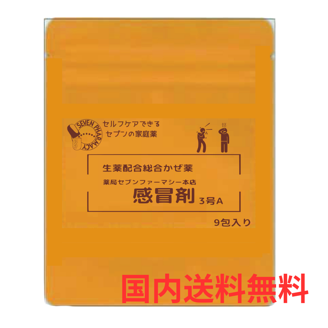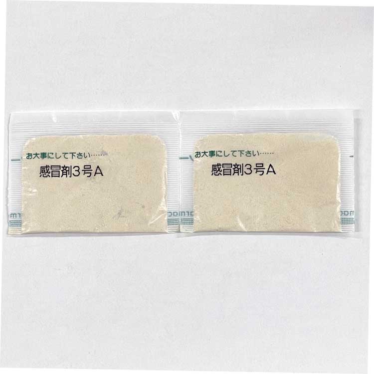 感冒剤3号Aは、かぜの諸症状を緩解するお薬で、アセトアミノフェン・エテンザミドは解熱・鎮痛効果を、dl―メチルエフェドリン塩酸塩散10%・クロルフェニラミンマレイン酸塩・ジヒドロコデインリン酸塩散1%・ノスカピンのそれぞれの働きで鼻水、鼻閉、せき、たん等の症状に、カンゾウ末・キキョウ末はのどのはれや痛みを緩解します。
