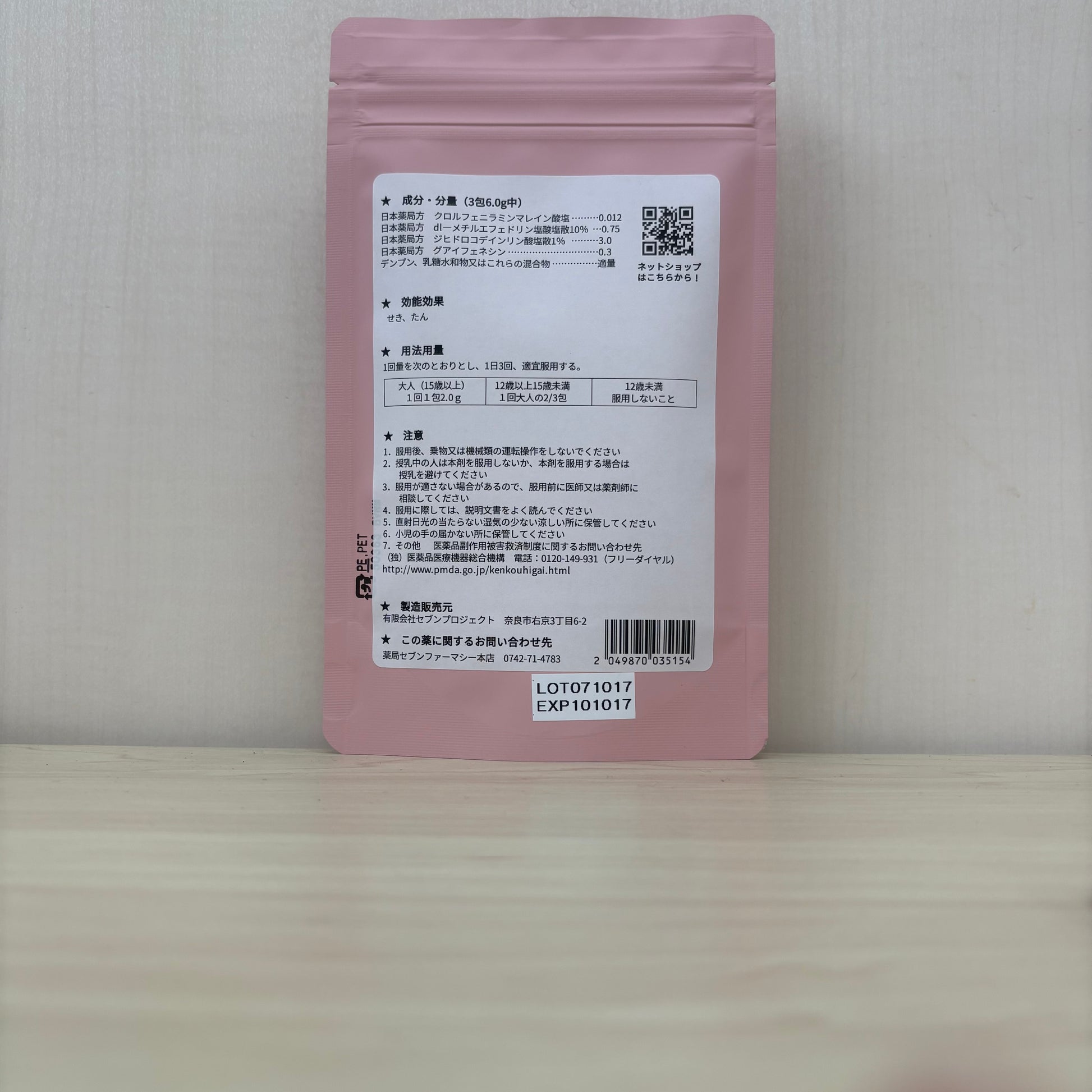鎮咳去痰剤8号は、クロルフェニラミンマレイン酸塩に dl―メチルエフェドリン塩酸塩散10%、ジヒドロコデインリン酸塩散1%、グアイフェネシンを配合した、せき・たんに用いる内服薬です。