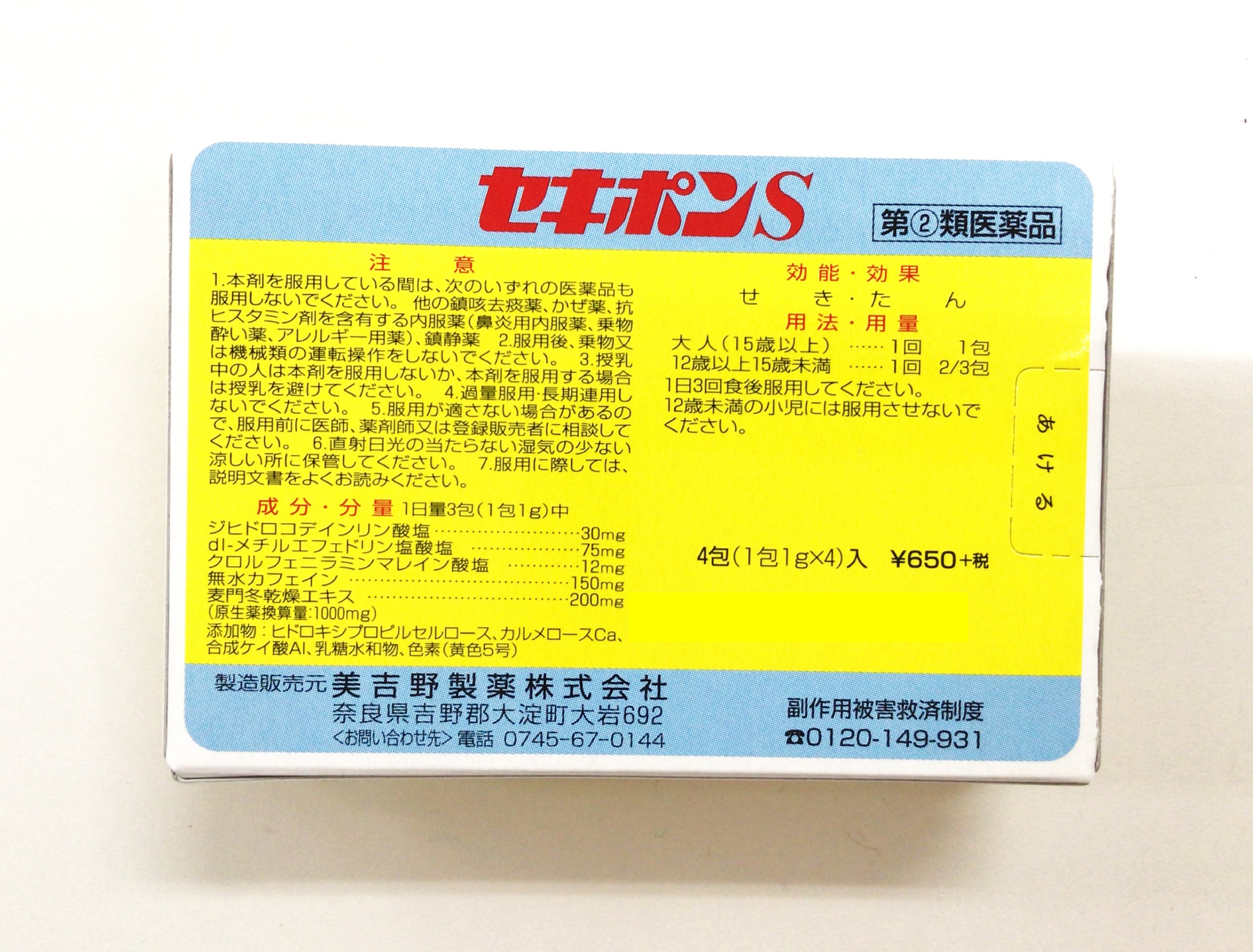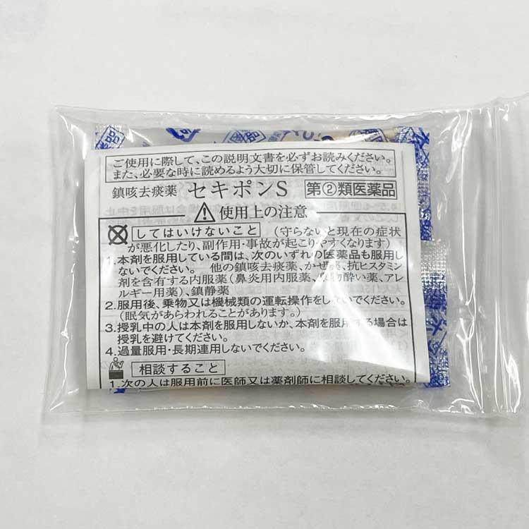 セキポンSは,咳中枢に働いて咳を鎮めるジヒドロコデインリン酸塩,気管支を拡げ咳を鎮めるdl-メチルエフェドリン塩酸塩,鼻水・鼻づまり・くしゃみ・のどの不快感を取り除くクロルフェニラミンマレイン酸塩,気道粘膜を潤し痰を切りやすくして咳を鎮める麦門冬乾燥エキス等を配合した服用しやすい鎮咳去痰薬で,せき,たんに効果があります。
